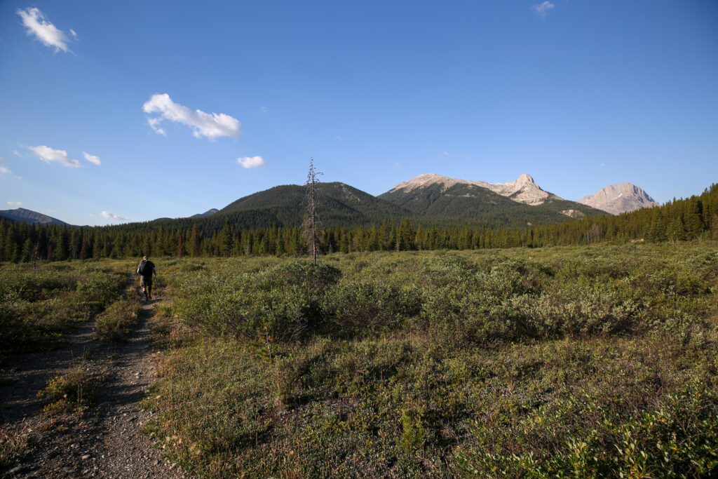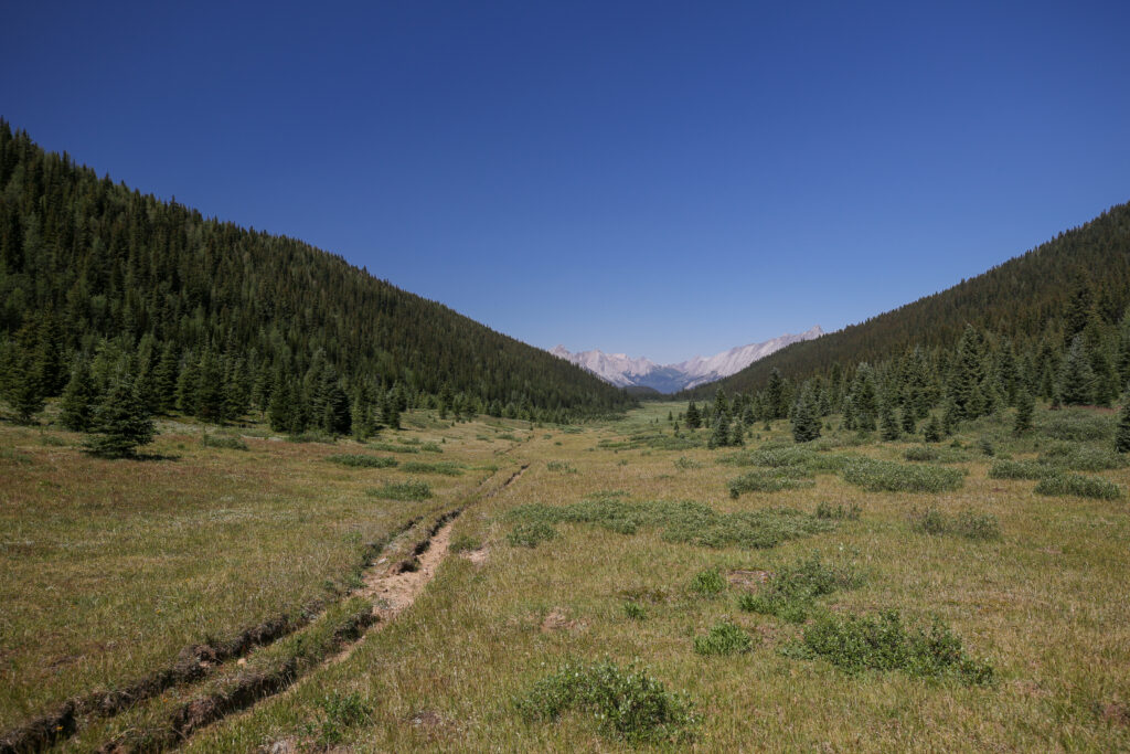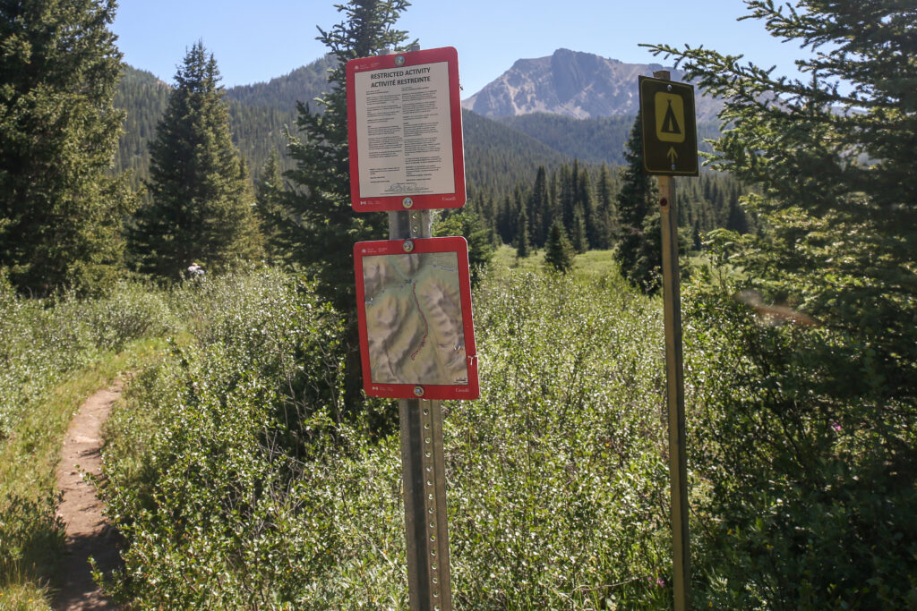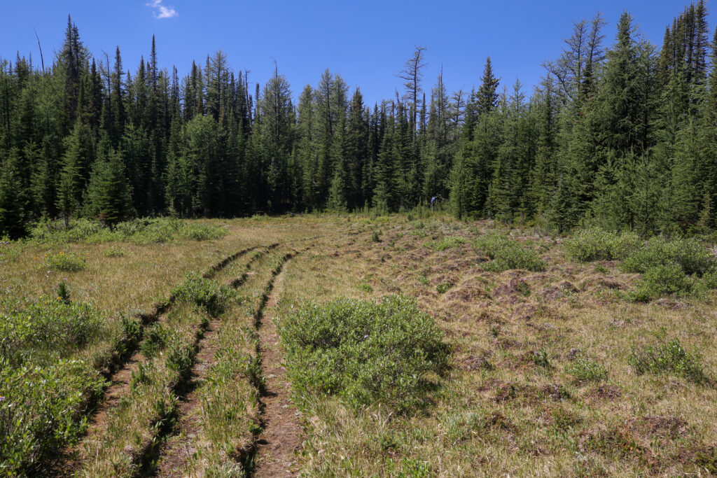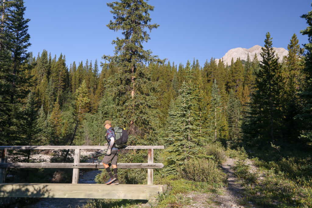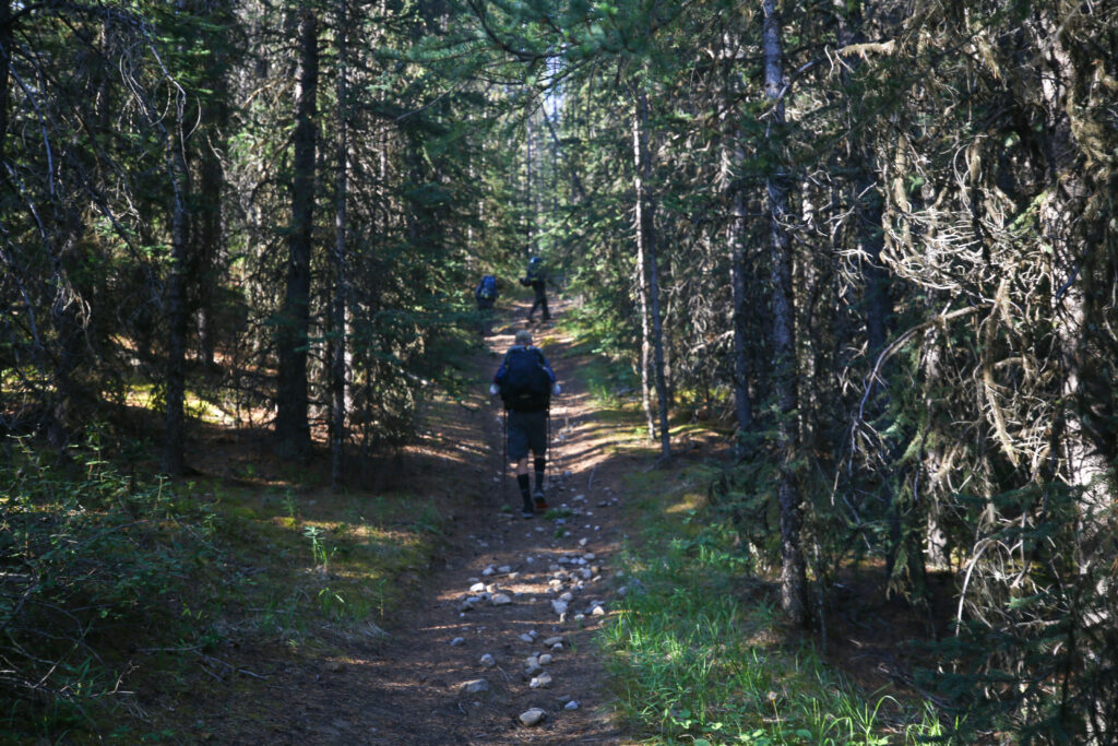 The main trail walks through a wide meadow for a couple of kilometres before reentering the forest. Shortly after entering the forest we quickly came upon a short but very sharp descent down to the outlet creek from Sawback Lake. The trail dropped 100 m in just 1/2 a km on very gravelly footing. After arriving at a nice bridge across the creek it was a short rise up to the campground trail.