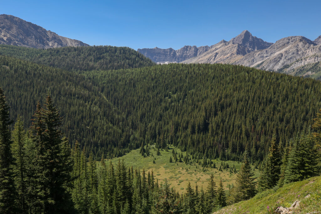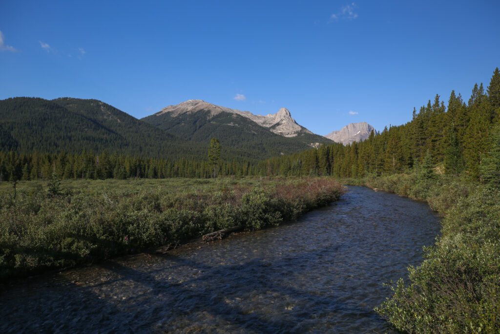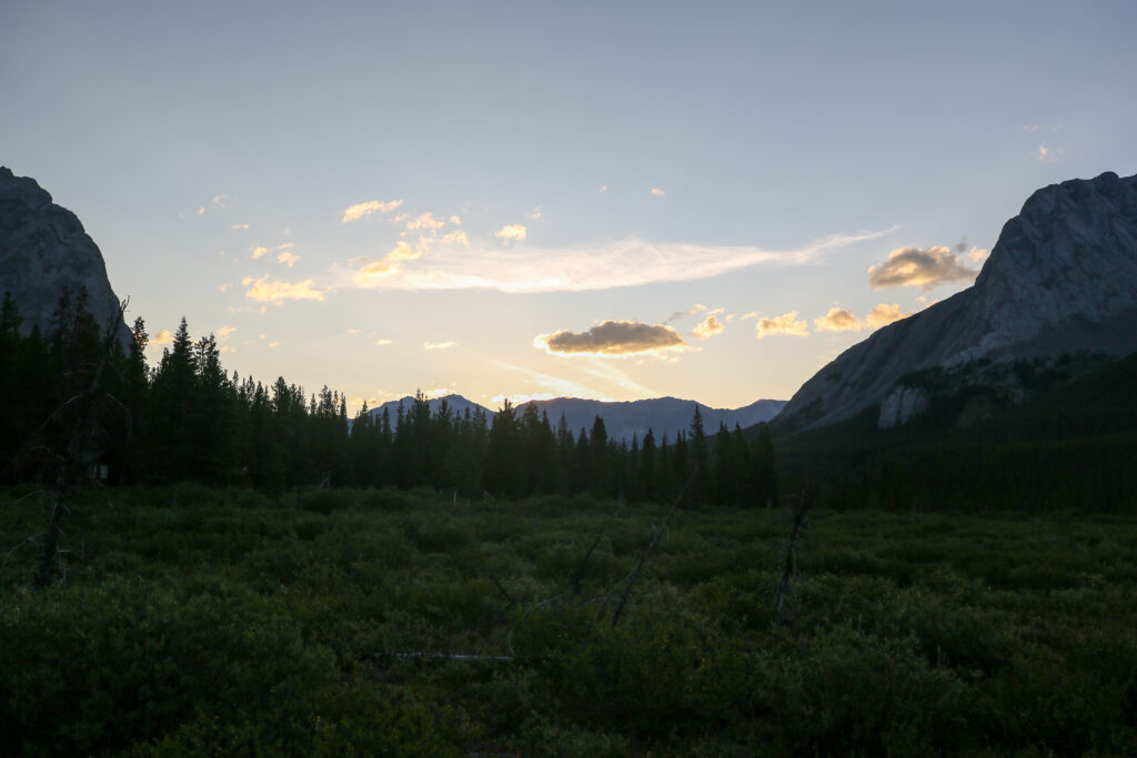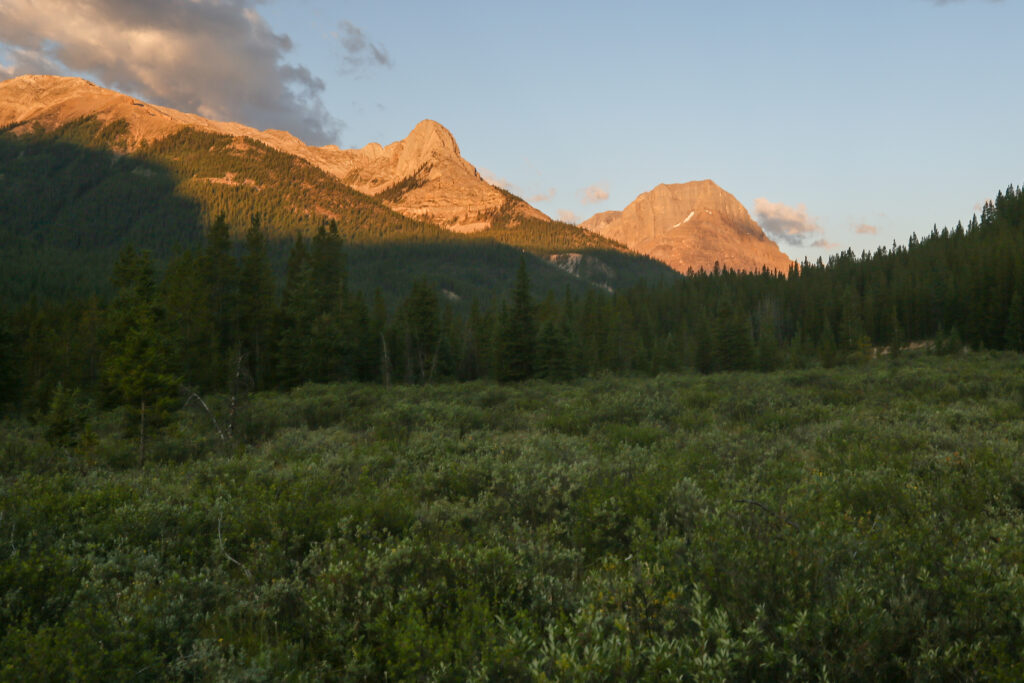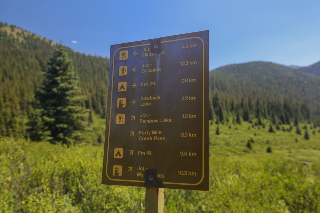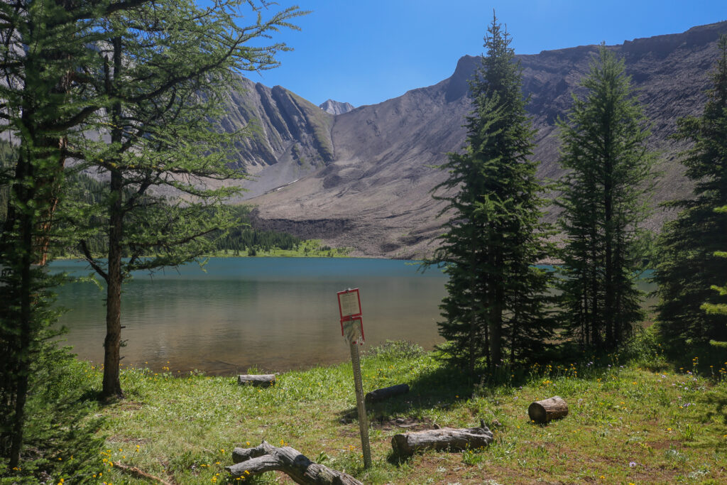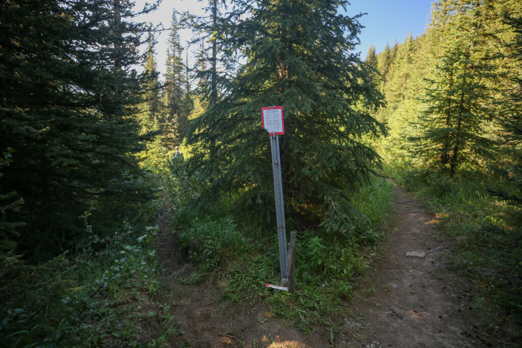 The main trail walks through a wide meadow for a couple of kilometres before reentering the forest. Shortly after entering the forest we quickly came upon a short but very sharp descent down to the outlet creek from Sawback Lake. The trail dropped 100 m in just 1/2 a km on very gravelly footing. After arriving at a nice bridge across the creek it was a short rise up to the campground trail.