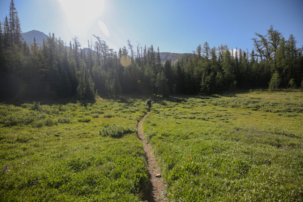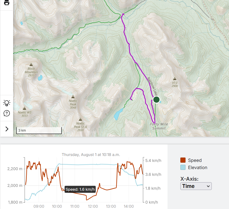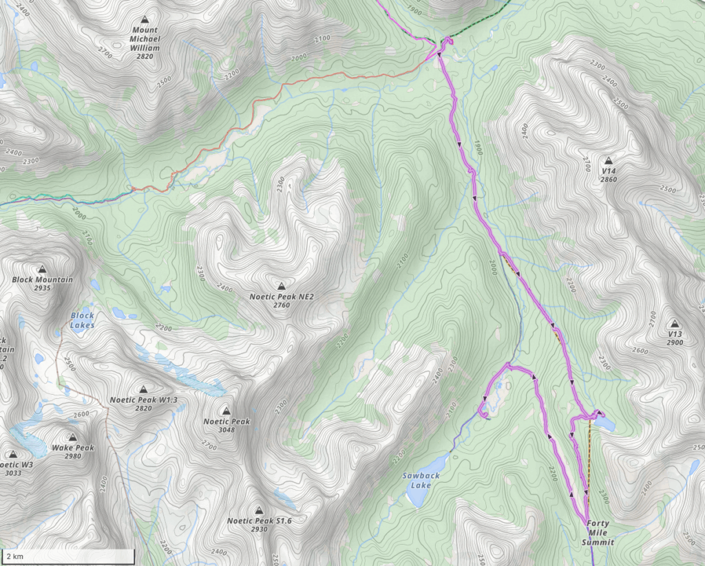 We did not back track to the main trail but headed south to reconnect with the main trail in the meadow below 40 Mile Summit where would would do a 180 degree turn and head north back to Sawback Lake CG. There is no direct way to Sawback Lake CG from Rainbow Lake but by following our route the trail was predominantly downhill all the way to camp.