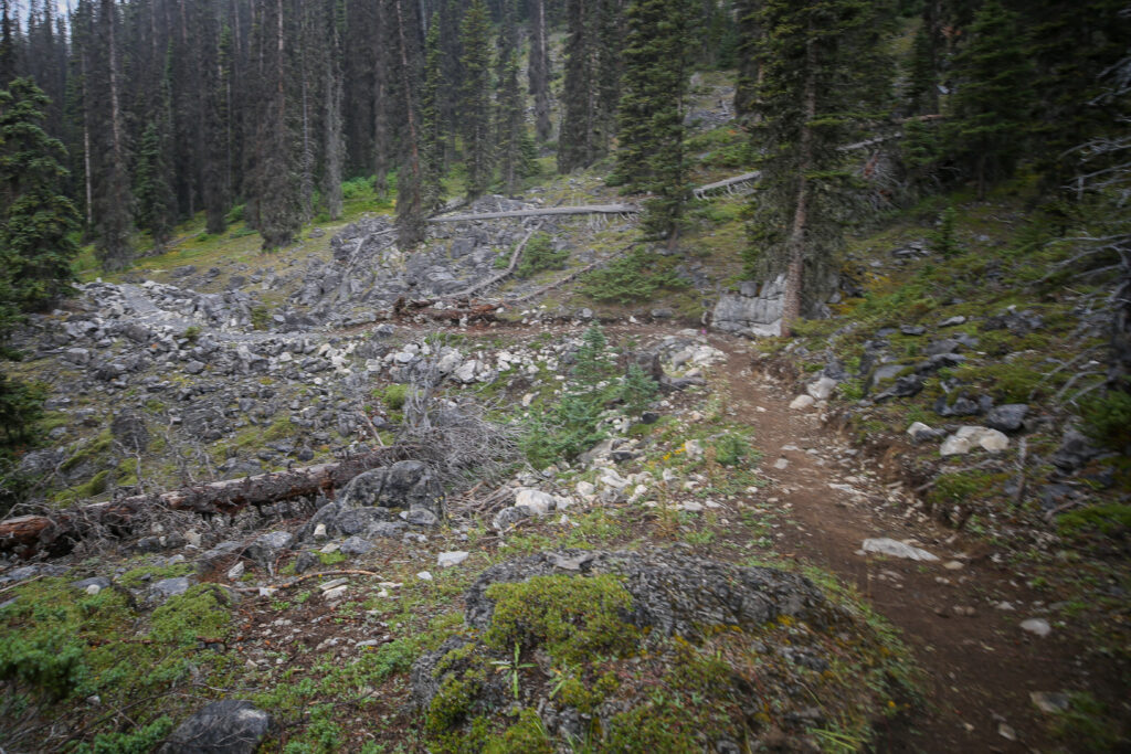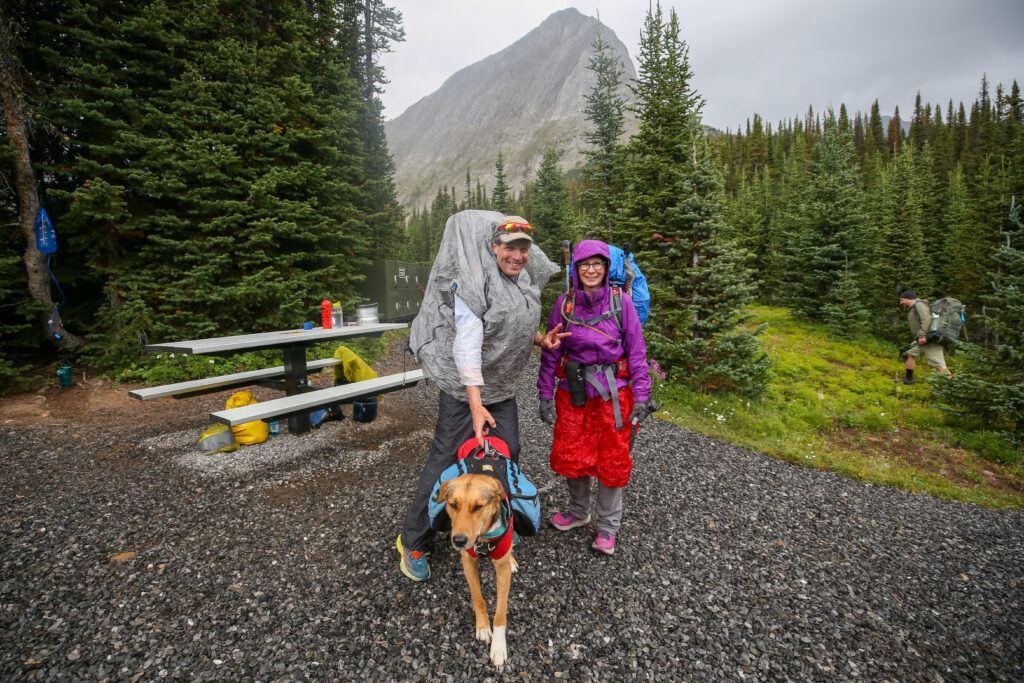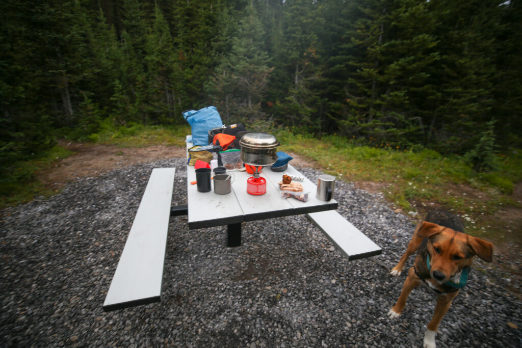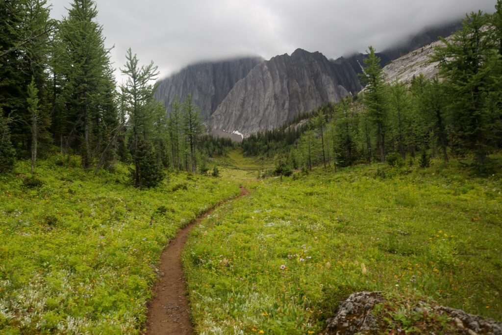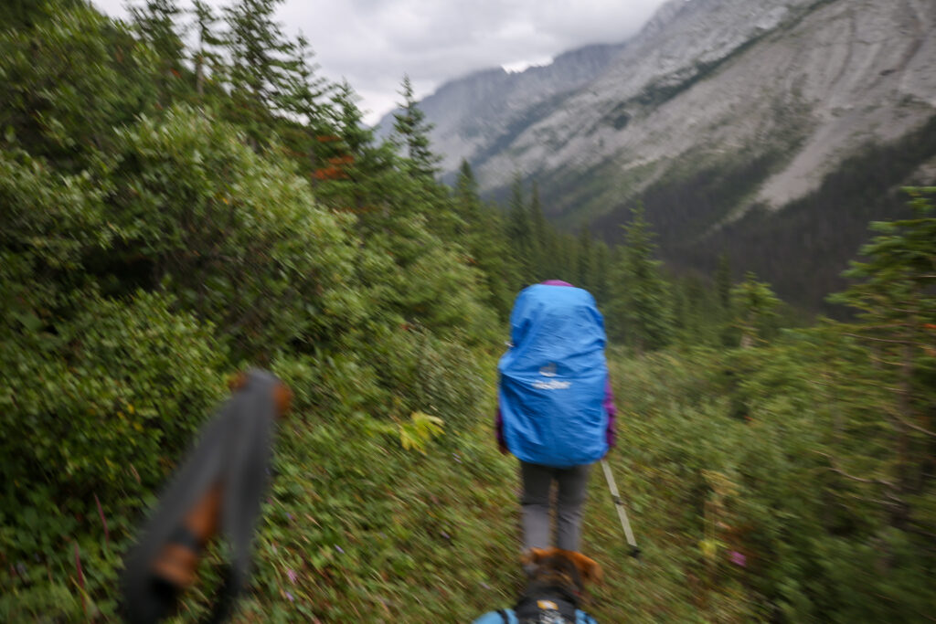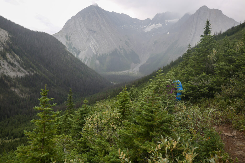 I had the coffee on by 7:00 am. Unlike dinner the night before the eating area was a hive of activity. We talked to a few of the campers getting ready for the day including a father and son duo who were heading over North Kananaskis Pass aiming for Palliser Pass for another two nights in the backcountry. Unfortunately the weather forecast was calling for a couple of days of rain and the father looked way more enthusiastic than the son. I said in a cheerful voice to “enjoy the trip” but I was afraid it could turn into a bit of a soggy slog. As we were finishing up our oatmeal the sky opened and it started to drizzle on us. Luckily the tent was in a bit of a protected area so we were able to pack up and stay mostly dry.