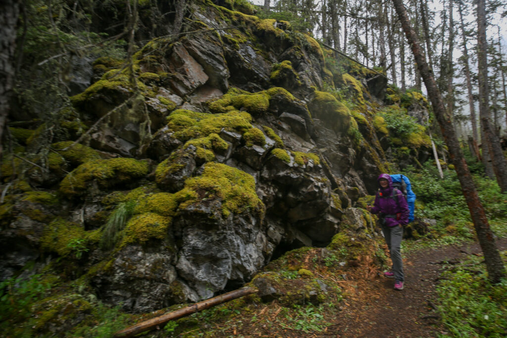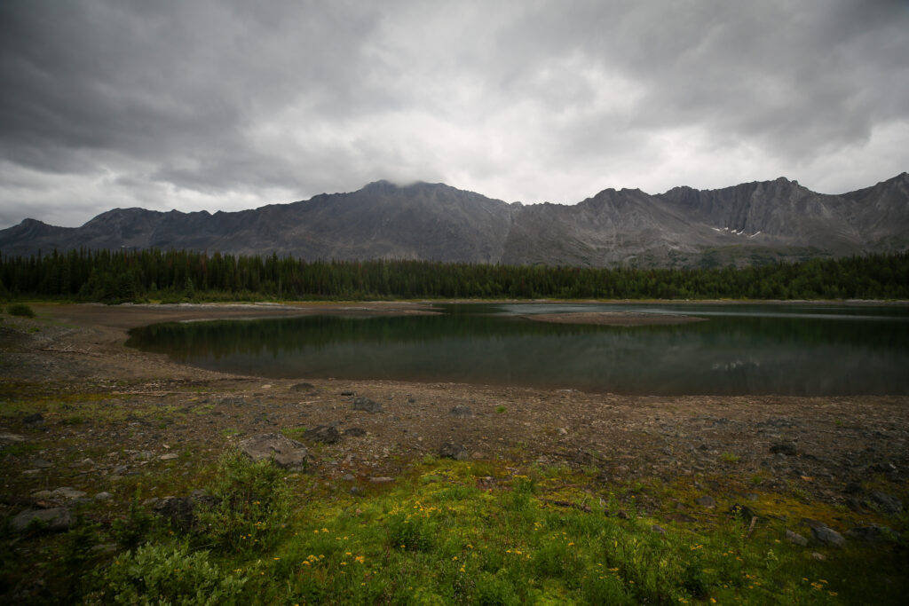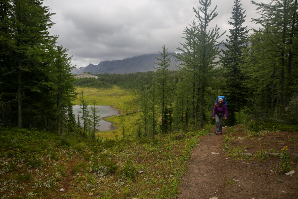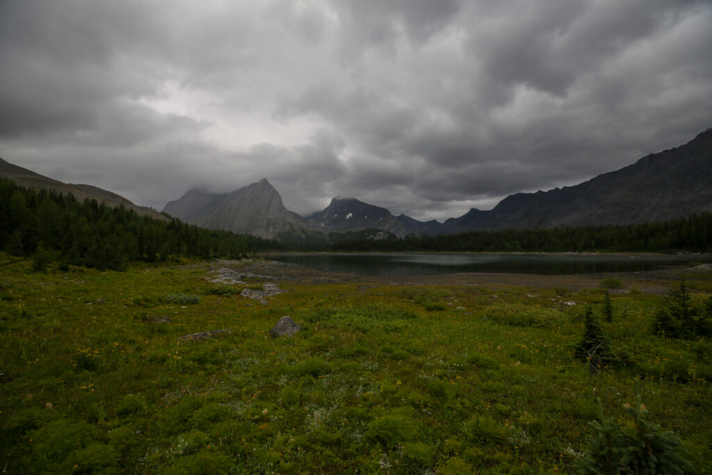 It was still drizzling lightly in camp as we left. The initial walk took us past Lawson Lake. The clouds started to lift making for a moody and interesting skyscape.