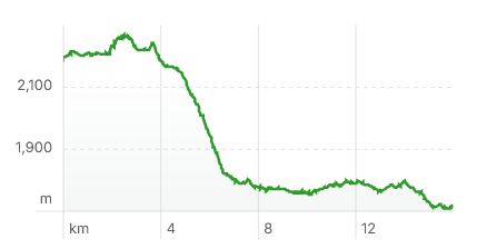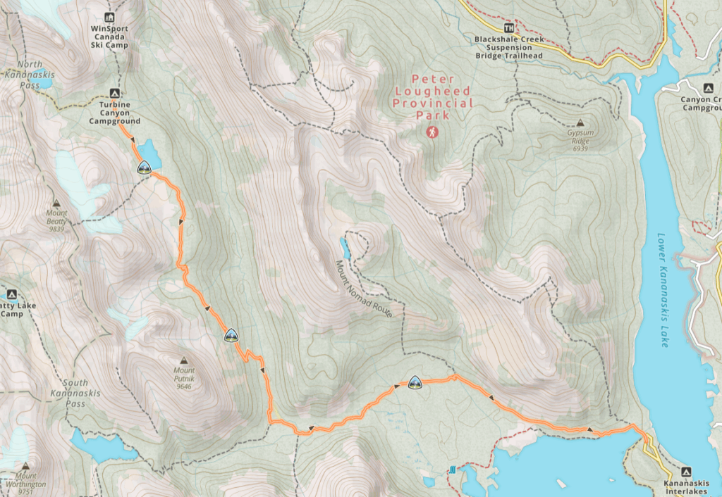 Day 3 Turbine Canyon CG to Interlakes Parking Lot, 16 km, 147 m elevation gain, 631 m elevation loss, 5 hrs 20 min.